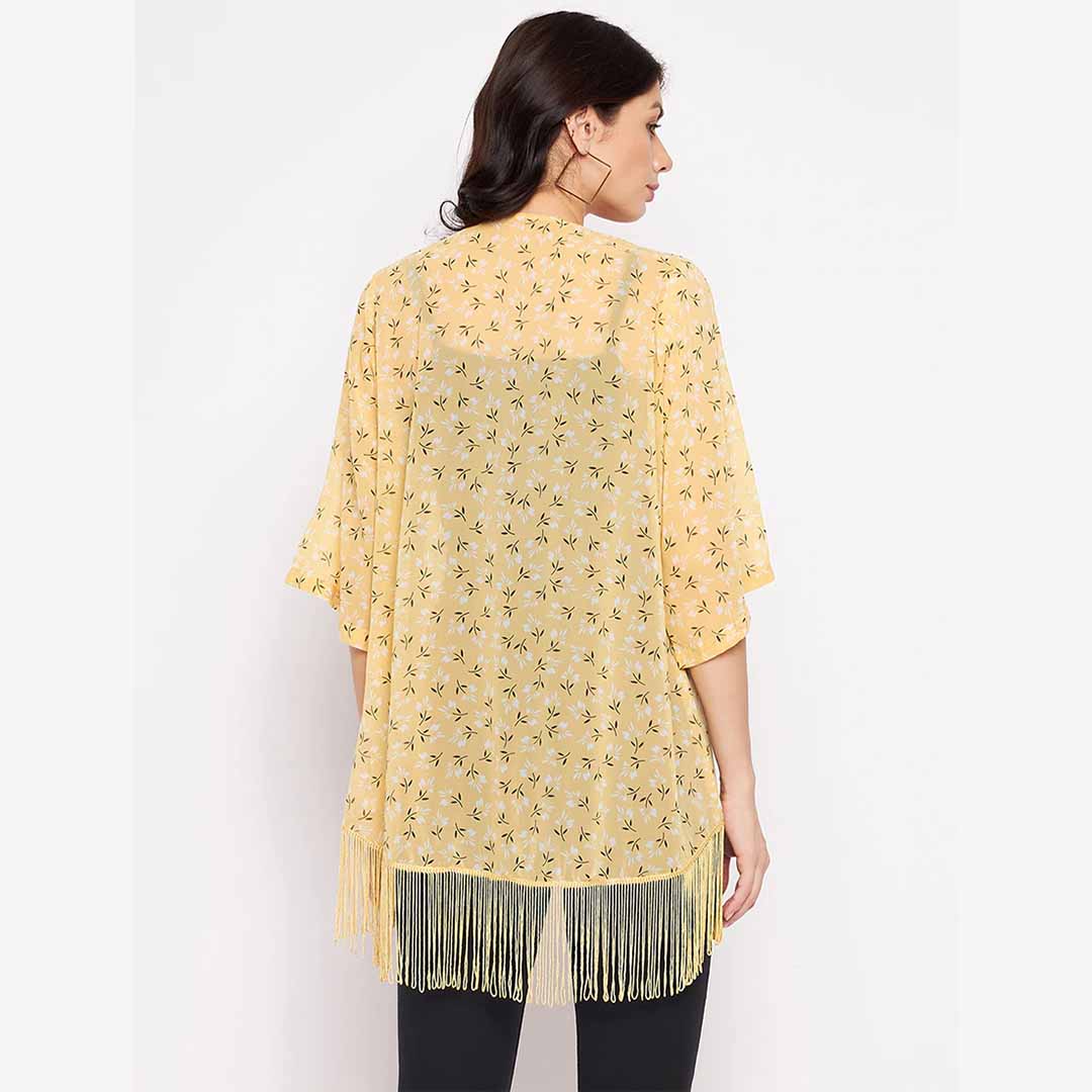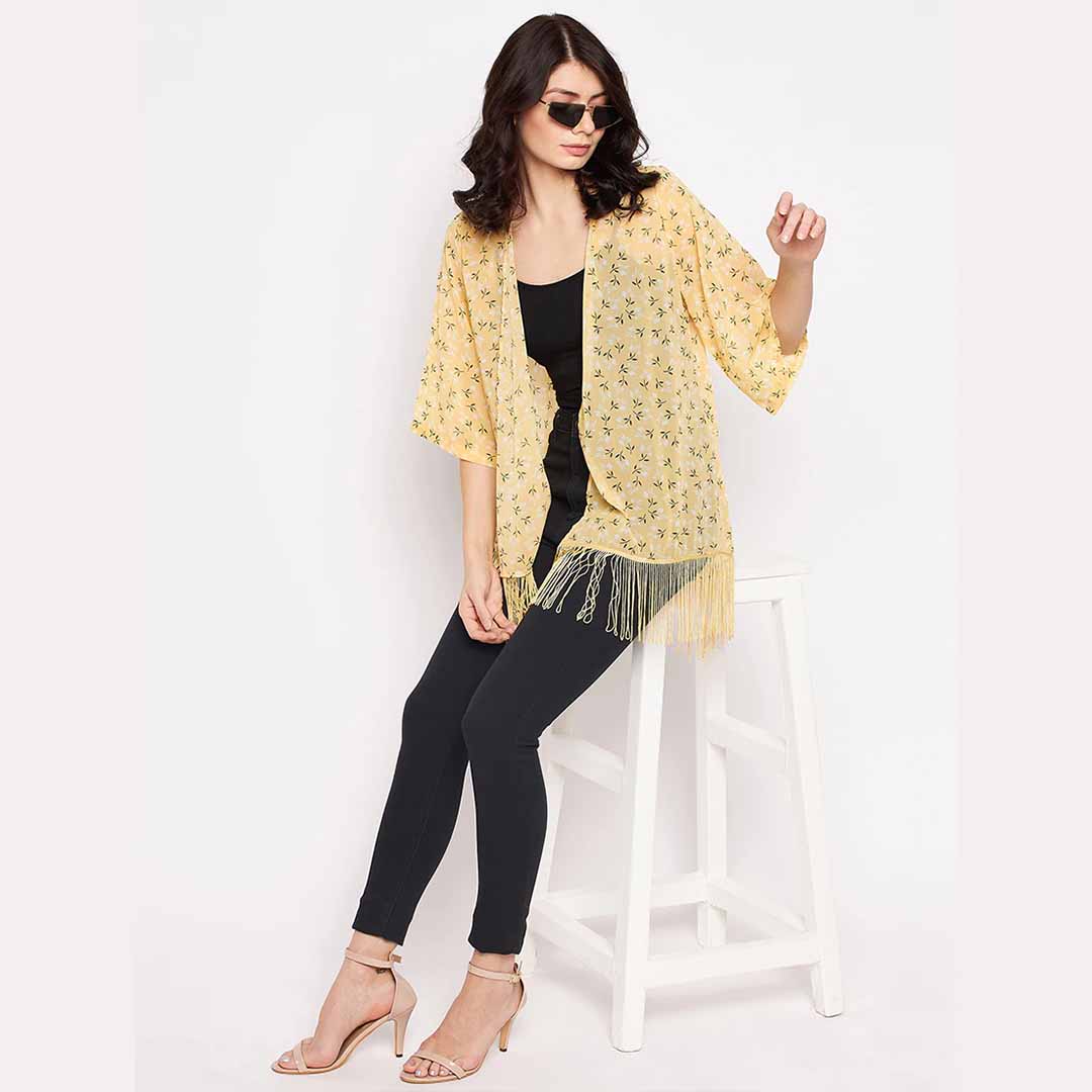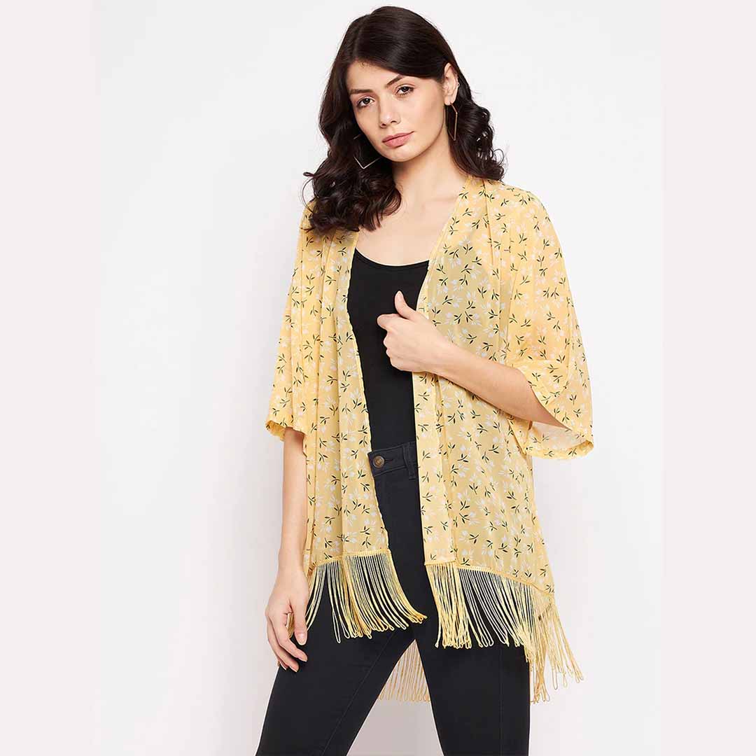 floral print fringe up to witness some stylish collection of shrugs! conveys to you the best gathering from that come in a melange of yellow shades. lt brings to you an enormous accumulation of shrugs in quirky prints that you can avail in free size sizes.