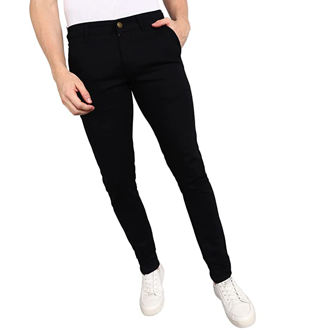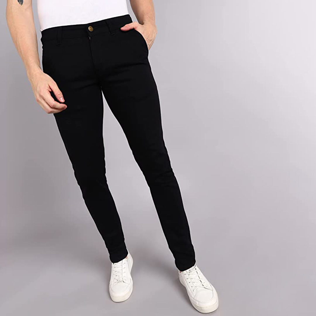 Color: Black Pockets: 4 Fit Type: Regular Fit Fabric: Cotton Lycra Fabric with Stretch Care Instructions: Mild Wash, wash separately Pattern : Solid Style Zip : Zip Fly with Button Closure