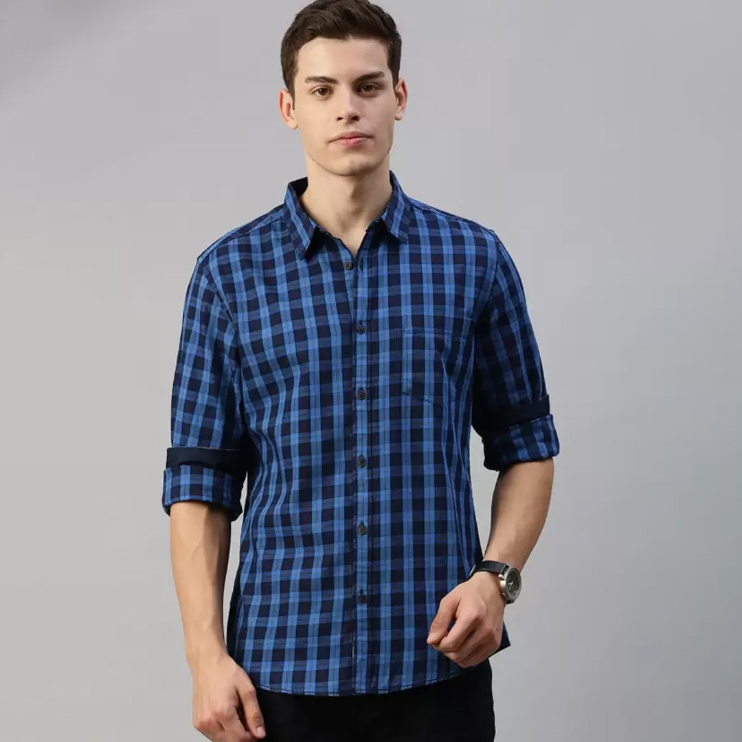 Blue checked casual shirt, has a spread collar, long sleeves, button placket, curved hem, and 1 patch pocket. Keep warm on the coldest of days with this top-of-the-line shirt. Head to a casual outdoor event with family and friends in this blue shirt with distressed jeans and canvas sneakers.