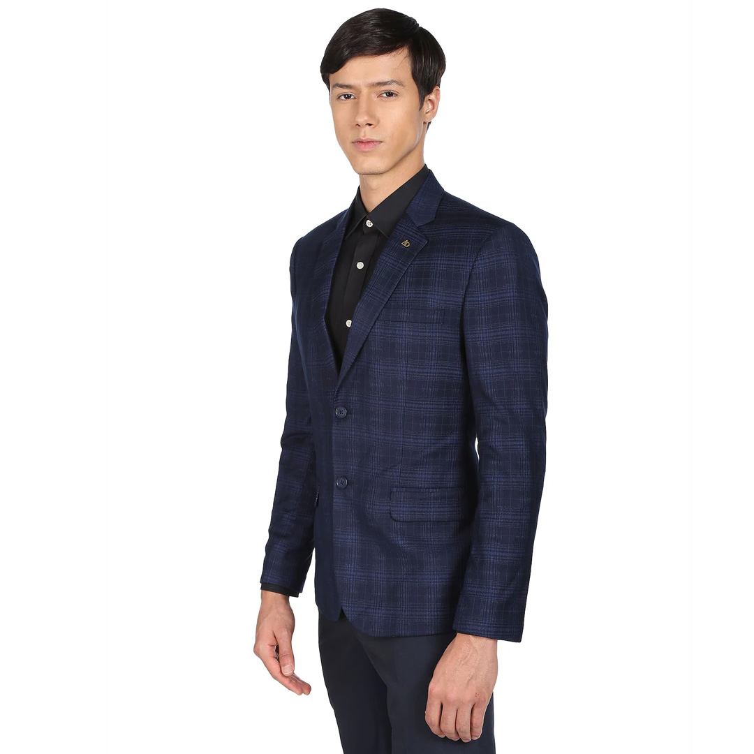 experience fine tailoring and an impeccable fit in the formal blazer. this tailored fit number is designed with a sharp notched lapel, metallic collar pin, long sleeves and a double vented back hemline.