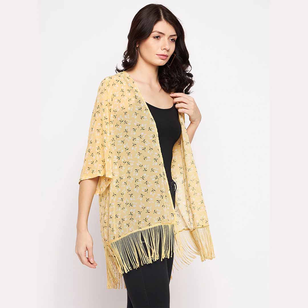 floral print fringe up to witness some stylish collection of shrugs! conveys to you the best gathering from that come in a melange of yellow shades. lt brings to you an enormous accumulation of shrugs in quirky prints that you can avail in free size sizes.