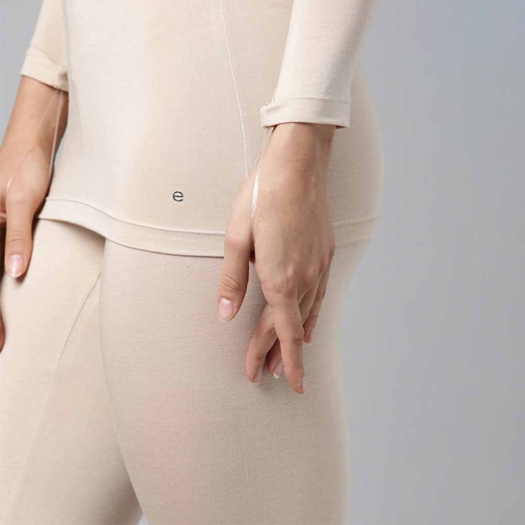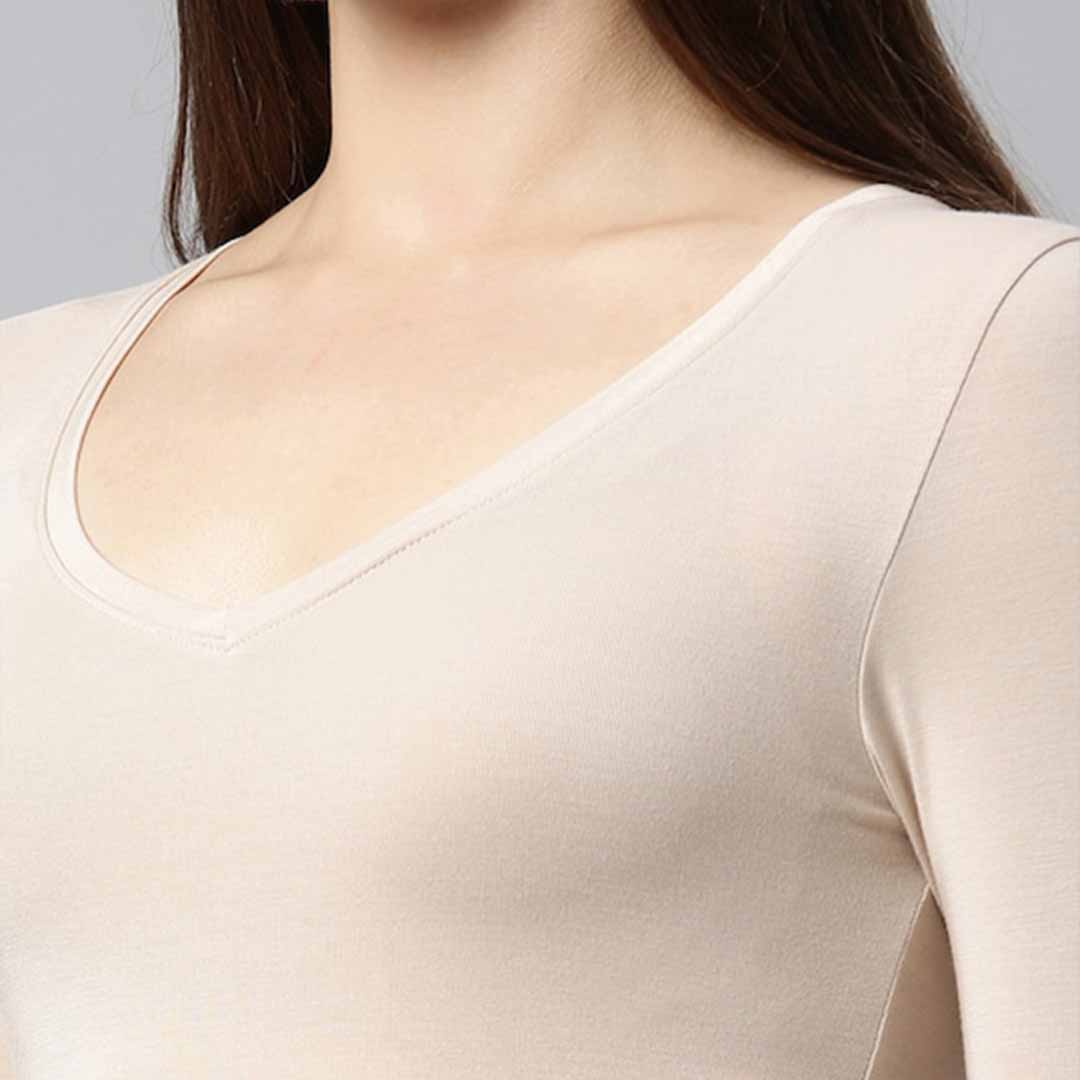 Beige -colored solid woven thermal top in a patterned weave, has a V neck and three -quarter Sleeve