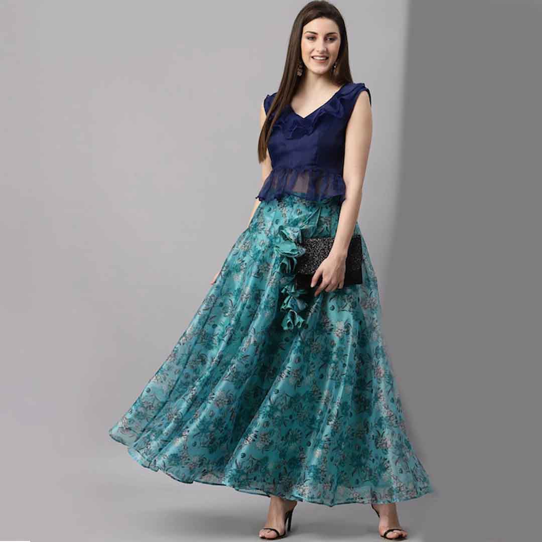 Turquoise blue floral printed flared maxi skirt has an waistband with zipper closure, tassel details and flared hem