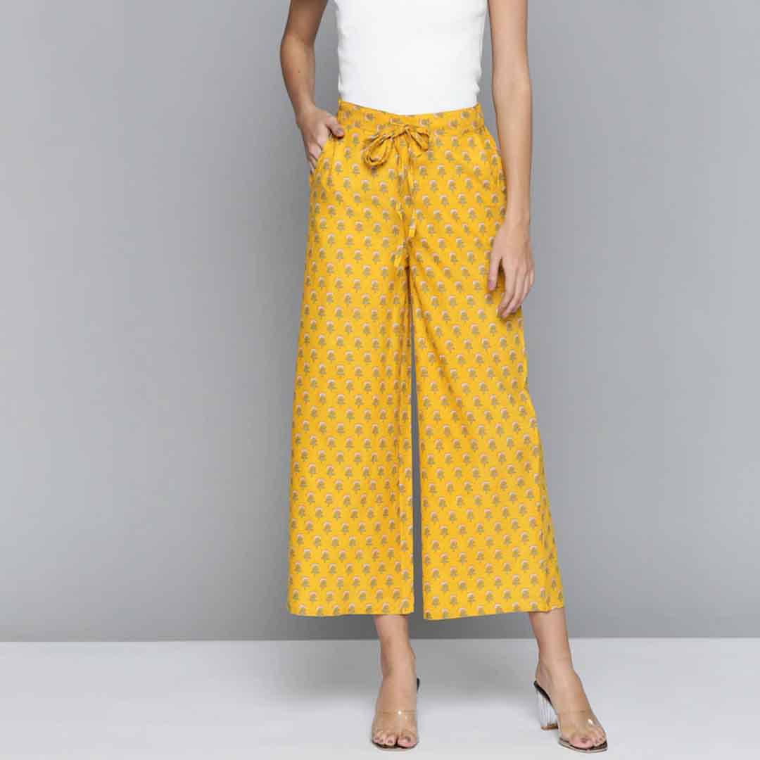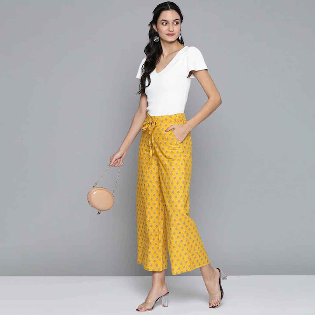 Yellow and off-white ethnic print wide leg cropped palazzos
